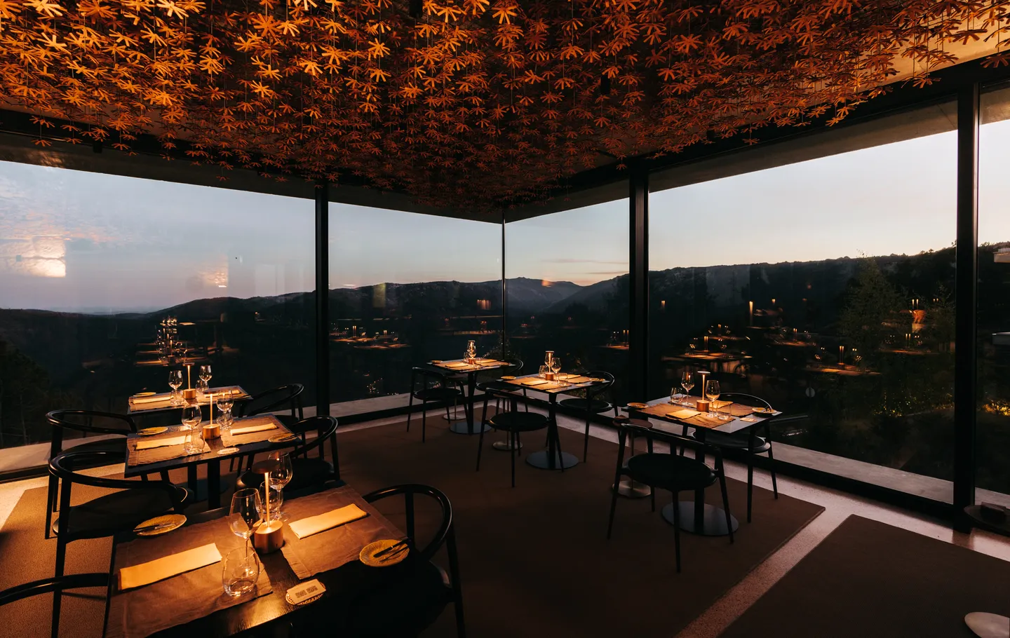 À mesa, a paisagem aprimora a experiência: janelas abertas sobre o panorama montanhoso, um teto de estrelas douradas em burel, criam um ambiente elevado e harmonioso.
